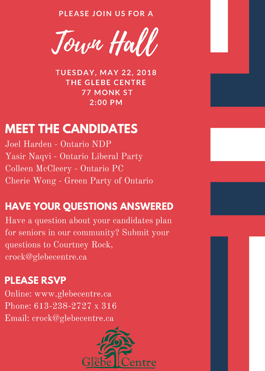 Have a question about your candidates plan for seniors in our community? Submit your questions to Courtney Rock, crock@glebecentre.ca