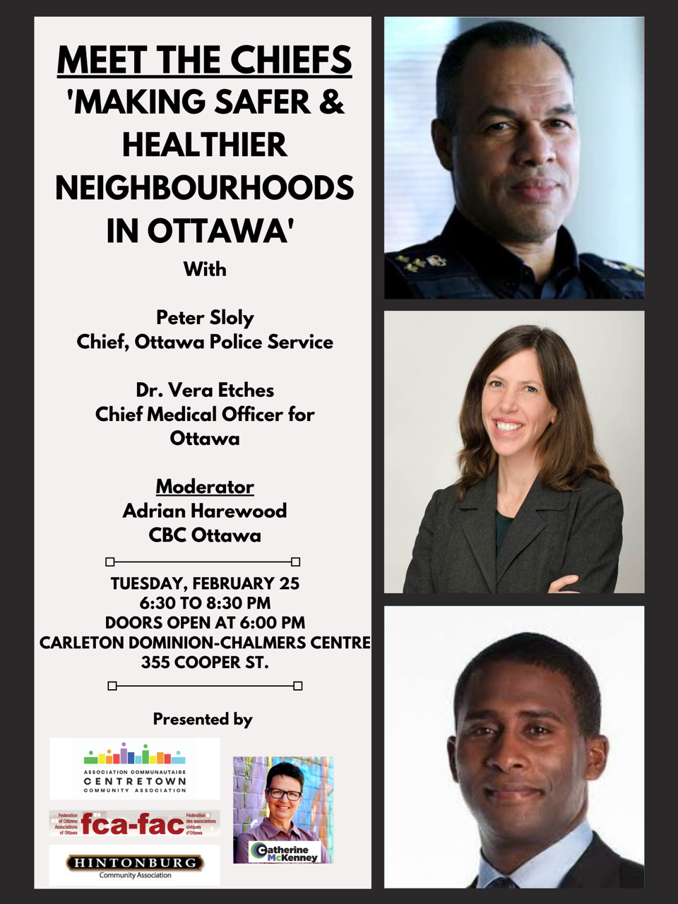 Community associations, the FCA and Councillor Catherine McKenney are jointly sponsoring “Meet the Chiefs” February 25. This is an opportunity for folks to hear and ask questions of the new Chief of Police and Ottawa’s Chief Medical Officer.